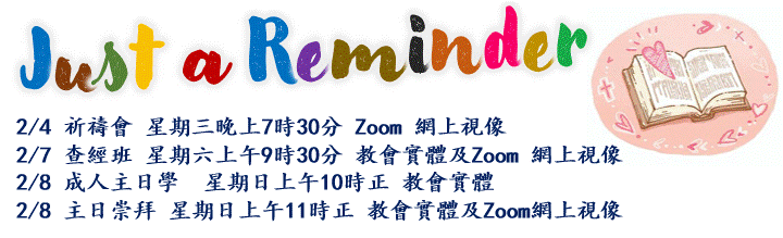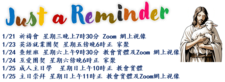 【英語就業團契】將於1月23日(星期五)晚上 6時在胡傳道夫婦家舉行第一次聚會。誠摯邀請您告知胡傳道夫婦是否能出席,或是否有子女、兄弟姊妹或朋友對此聚會有興趣參加。期待與大家相聚,任何查詢請聯絡Pastor Steven。